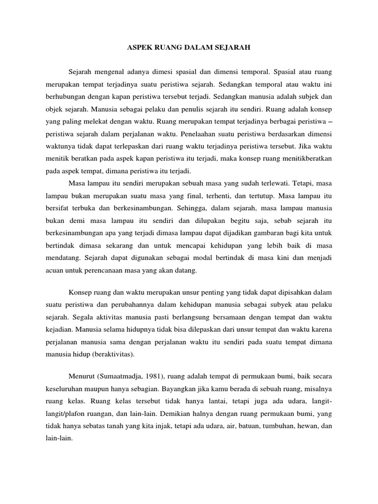 Peristiwa hanya akan terjadi pada suatu tempat tertentu. Adanya ruang membuat penulis sejarah mengkategorikan sejarah berdasarkan tempat, seperti sejarah lokal, daerah, nasional, dunia, dll. Demikian pembahasan singkat mengenai pengertian ruang dan waktu dalam sejarah secara singkat beserta contohnya. Sejarah ialah sebagai suatu ilmu dimana kata sejarah berasal dari bahasa arab syajara yang artinya ialah terjadi keterkaitan konsep ruang & waktu dalam sejarah. Sejarah dimaksud dalam definisi sejarah manusia sebagai pelaku sejarah.